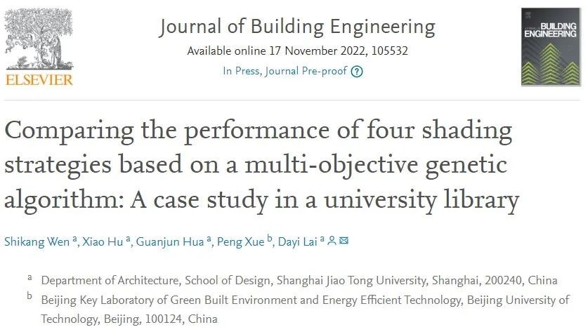WEN Shikang, an undergraduate student from the Department of Architecture, School of Design, Shanghai Jiao Tong University, has published an academic paper “Comparing the Performance of Four Shading Strategies Based on a Multi-Objective Genetic Algorithm: A Case Study in a University Library” as the first author on Journal of Building Engineering. Based on the multi-objective genetic algorithm, this research proposes a method for selecting and designing building sun-shading strategies, and applies this method to the improvement design of a library’s light environment.