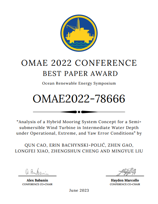 The 42nd International Conference on Ocean, Offshore & Arctic Engineering (OMAE) was held in Melbourne, Australia from June 11 to 16, 2023. At the opening ceremony of this conference, the conference co-chair announced the "Best Paper Award" of the 41st International Conference on Ocean, Offshore & Arctic Engineering (OMAE). The academic paper titled " Analysis of a Hybrid Mooring System Concept for a Semi-submersible Wind Turbine in Intermediate Water Depth under Operational, Extreme, and Yaw Error Conditions" stood out from over 900 accepted papers through the expert review and conference review. This awarded paper is co-authored by PhD Qun Cao from School of Naval Architecture, Ocean and Civil Engineering (NAOCE), Professor ERIN BACHYNSKI‐POLIĆ from Norwegian University of Science and Technology (NTNU), Professor Zhen Gao, Professor Longfei Xiao, Associate Professor Zhengshun Cheng and Assistant Professor Mingyue Liu from Shanghai Jiao Tong University (SJTU).