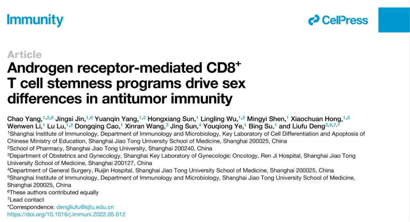 2022年6月13日,澳门十大信誉好的网站邓刘福教授团队在国际著名期刊Immunity发表了题为Androgen receptor-mediated CD8+ T cell stemness programs drive sex differences in antitumor immunity的研究论文。该研究发现了肿瘤浸润性CD8+ T细胞干性维持能力是调控肿瘤免疫性别差异的关键因素,而内在的雄激素受体(Androgen receptor,AR)信号通路显著抑制干细胞样CD8+ T细胞亚群的维持。该研究为理解肿瘤性别差异提出了新的理论解释,为再认识内分泌系统调控肿瘤免疫应答呈现了新的视角,同时为靶向AR信号通路通过重编程CD8+ T细胞干性增强肿瘤免疫治疗提供了科学依据。