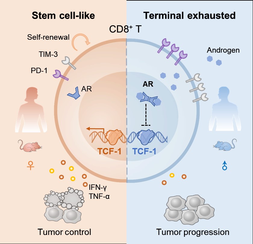 综上所述,该研究揭示了肿瘤性别差异的免疫调节新机制,阐明了干细胞样CD8+ T细胞分化存在性别差异,发现了雄激素参与调控肿瘤免疫逃逸的新途径,明确了内分泌系统、免疫系统和肿瘤之间的内在联系,为靶向AR信号通路增强肿瘤免疫治疗效果提供了新的方向。