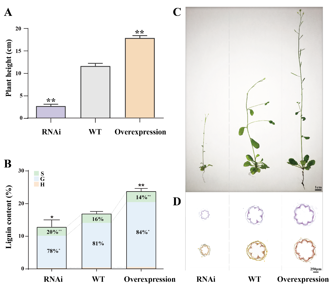 图2. 异源转化:转基因拟南芥形态学特征及木质素含量与组成