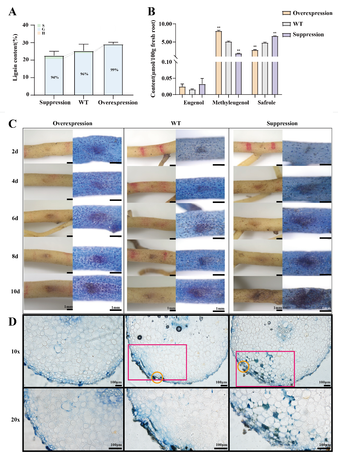 图3. 同源转化:转基因细辛木质素与苯丙烯含量变化及根部病害抗性的变化