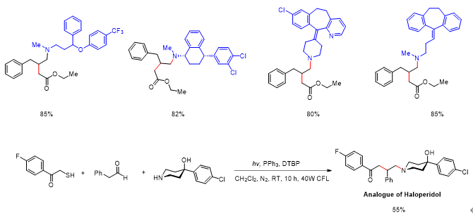 为了验证该方法的实用性,作者利用该三组分反应实现了对仲胺药物结构的衍生修饰,并且一步合成了抗精神病药物氟哌啶醇类似物。