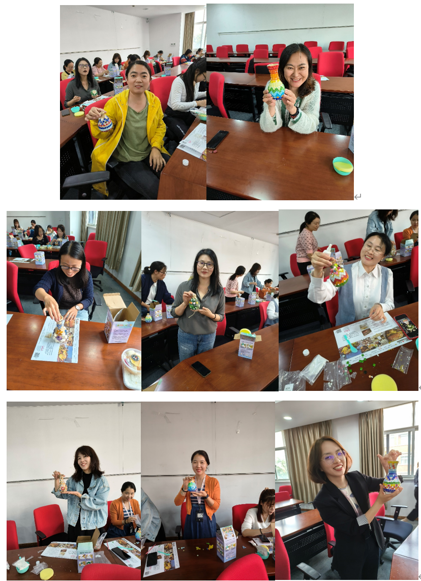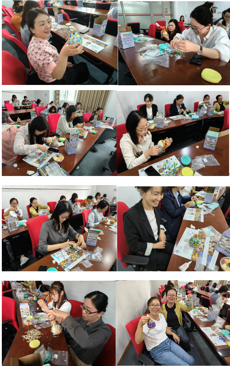 参加活动的女教职工在观看了视频演示后开始动手制作马赛克花瓶,首先要在拼贴马赛克碎片的位置涂上胶水,随后将马赛克碎片按照色彩层次和图形设计逐个粘贴到花瓶的素胚上,制作过程需要细致的观察和丰富的想象力。心灵手巧的药苑佳人充分发挥的自己的动手能力,用材料包里马赛克碎片,纽扣,贝壳,彩珠等等材料拼贴出了一个个色彩丰富,图形各异的花瓶,充分体现了大家对美的感知和表现力。