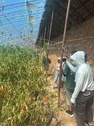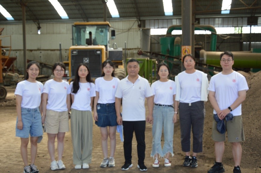 实践团成员进入生产基地学习了解从菌菇渣原料到肥料产品的生产销售的全过程,实地参观考察了原料储备车间、晒场、发酵池、产品生产车间、灌装车间。随后,实践团又到达产品应用试验基地大棚,实地考察肥料的使用效果。