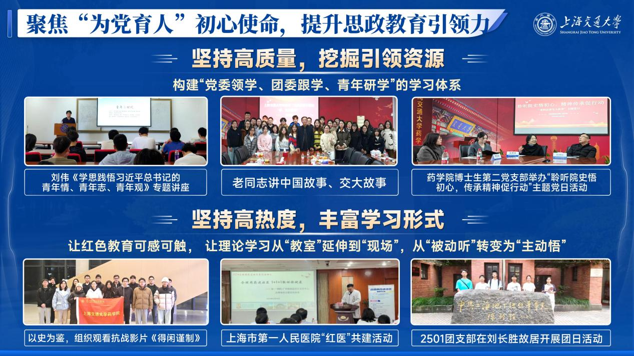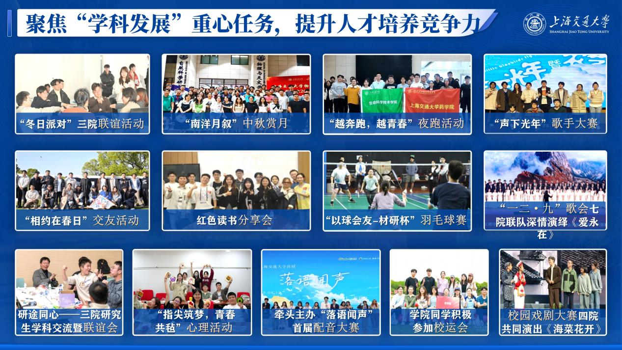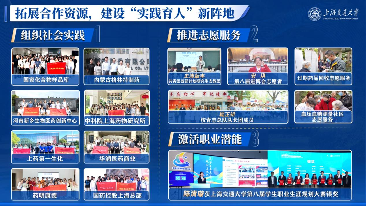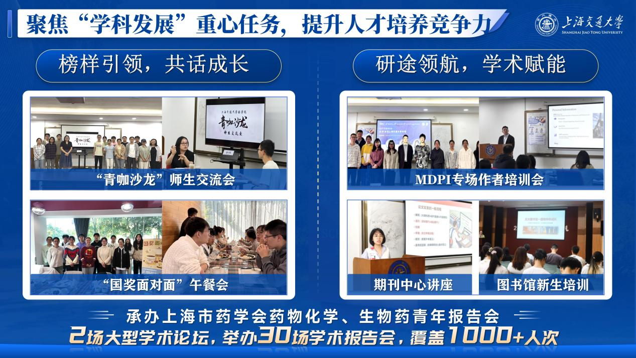 2. 面向药学专业特色,打造“专业育人”新名片围绕澳门十大信誉好的网站学科、学生特点,开展“靶向”人才培养质量提升计划。贯彻“学在交大”主旋律,营造澳门十大信誉好的网站“勤学、好学、乐学、互学”的学习氛围,整合校内外优质资源,打造高品质学术交流系列活动。承办上海市药学会药物化学、生物药青年报告会2场大型学术论坛,举办30场学术报告会;开展“学术赋能工作坊”“青咖沙龙”“国奖面对面”午餐会等活动,通过多样化科研引导,助力研究生提升学术素养;组织期末打卡集体自习活动,激发学生自主学习、比学赶超的积极性;举办升学经验分享会,邀请优秀学长学姐分享出国、保研经历;结合生源来源分析学业困难群体特点,日常开展有一对一的心理帮扶,考试周开展硬课、难课学业辅导和课程答疑,全方位为学生学业保驾护航。
