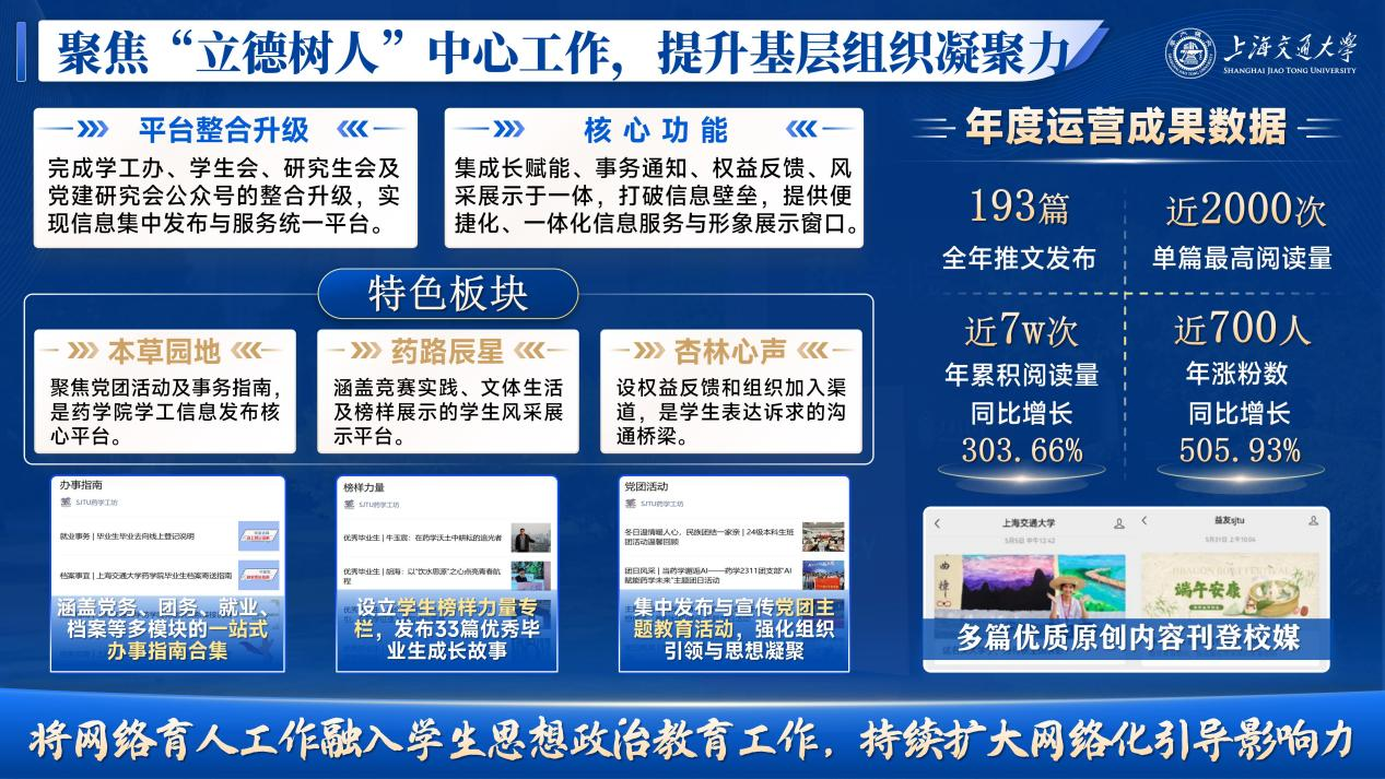 讲好药学故事与澳门十大信誉好的网站发展故事是学院声誉的重要体现,学院秉持科学、创新与服务社会融合的理念,持续完善多元化立体式宣传阵地,通过人民日报、光明日报、央视频等官方媒体,学校及学院官方网站、微信公众号等平台多渠道发声。完成学生会、研究生会及党建研究会公众号的整合升级,推出“SJTU药学工坊”,设置“本草园地”“药路辰星”“杏林心声”三个特色板块,打造集成长赋能、事务通知、权益反馈于一体的澳门十大信誉好的网站学生成长支持平台,有效打破信息茧房,为学生提供便捷化、一体化的信息服务渠道,全年发布推文193篇,累计阅读量近7万,成为信息传递的“主渠道”、服务同学的“微平台”,将网络育人工作融入学生思想政治教育工作,网络化引导的影响力持续扩大。