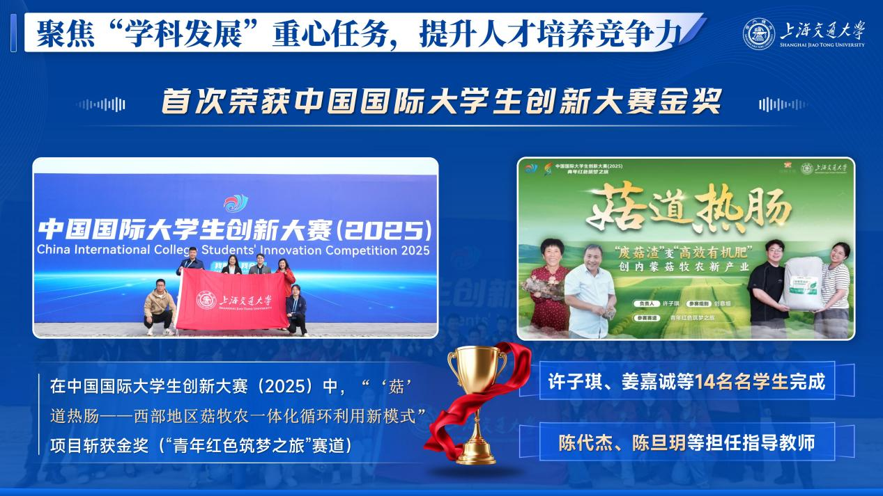 修订完善澳门十大信誉好的网站双创顶级赛事激励奖励制度,将赛事指导成果纳入专业教师年终考核,与绩效评定、奖金发放、招生名额、评优评先挂钩,充分调动专业教师参与科创指导的主动性;搭建“项目孵化-竞赛转化-成果落地”的全链条科创培育体系,广泛引导青年学子参与与“PRP”“大创”等科研训练课题,深度动员挖掘优质项目,以高水平学科竞赛为抓手,带动全院形成钻研学术、争先创优的浓厚氛围。今年科创竞赛成果取得历史性突破,在中国国际大学生创新大赛(2025)中,“‘菇’道热肠——西部地区菇牧农一体化循环利用新模式”项目首次斩获金奖,显著提升了学院在药学领域的人才培养口碑与学术影响力。