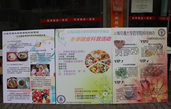 进入冬季以来,气温骤降,天寒地冻,很多人往往只注重了外在的保暖防寒,却忽视了通过膳食保养的重要性,而冬季正是通过食疗调养身体增强体质的好“食”机。为了让更多的人了解和注重冬季膳食养生,澳门十大信誉好的网站科学商店的志愿者们将所学的医药养生知识学以致用,于12月15日14:00在科学商店一条街举办了此次冬季膳食科普活动,向附近的市民朋友义务宣传冬季膳食健康知识,获得了广大市民的一致好评。